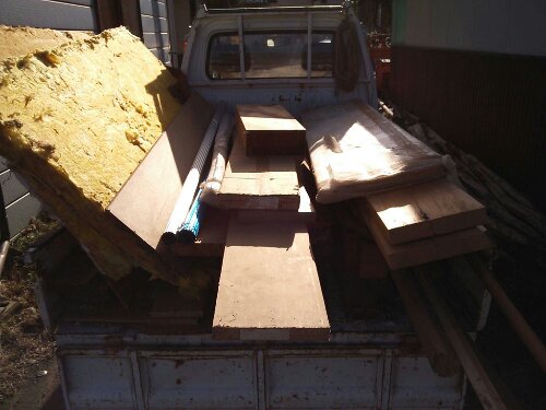 材木の後ろにペアガラスがしまってありました。ガラスの運搬は手間なので、物置の中で移動させることに。とりあえず体制はできたので、測定器の実物を見てから収容方法を考えることにします。