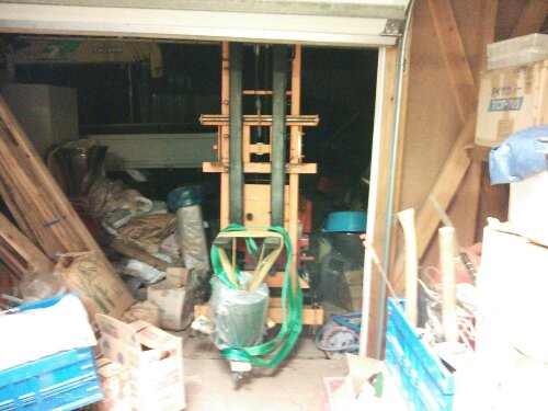 ハンドウインチで反対側を引いて真っ直ぐにして一度降ろし、うちの短いスレッドで3点吊り直し、フォークで吊ってガレージの中に入れました。ガレージはコンクリートなので、あとは押せば車輪で移動できるでしょう。住宅やパネルバンで重量物を扱う時はいつも上下のクリアランスで苦労します。