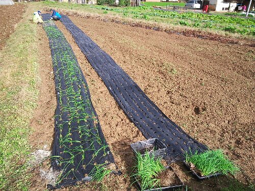 今日は3畝目のマルチを張り、左側から植え始めました。品種はケルタマです。最後の方は細い苗なので2-3本一緒に植えました。育ってくれるかどうか。終わったところに赤玉ねぎを数本だけ植えました。一箱でそれだけしか残らなかったのです。